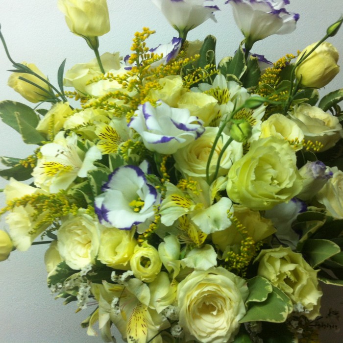 Топли цветове, поднесени в комбинация от различни разновидности на еустома и розички.