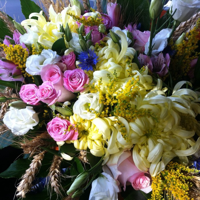 Пъстър аранжимент от различни цветя и плодородно жито.