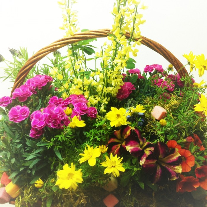 Подходящо аранжирани сезонни цветя в подходяща кошница.*растенията варират в зависимост