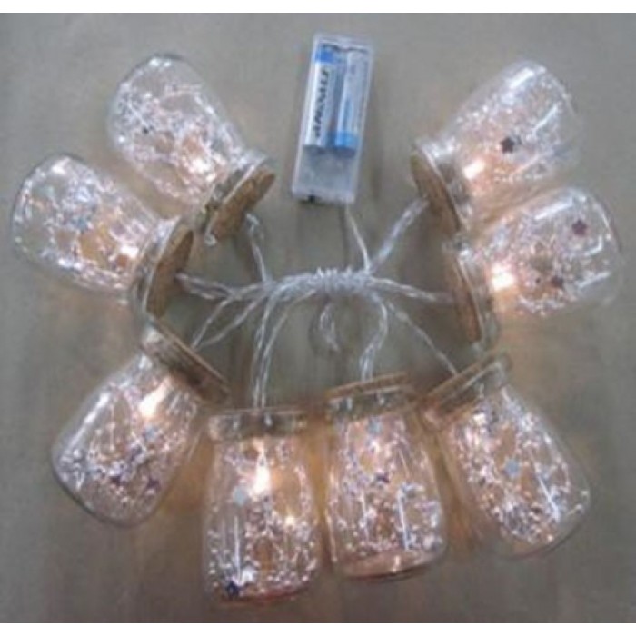Гирлянд LED светлина, батерии, 8 бр. стъклени буркани с вграден декор, златни звезди, 6х8 см