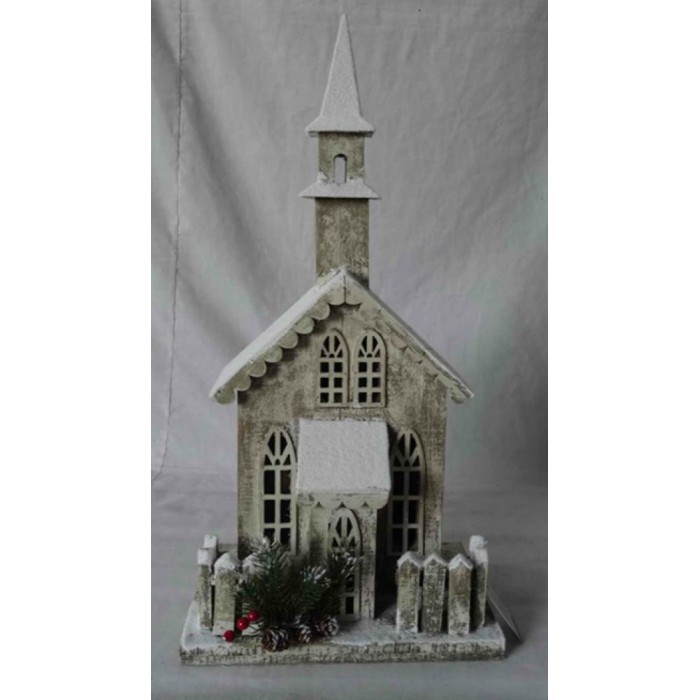 Дървена заснежена къща с 10 LED лампички, сиво претрито, 8х18х63 см