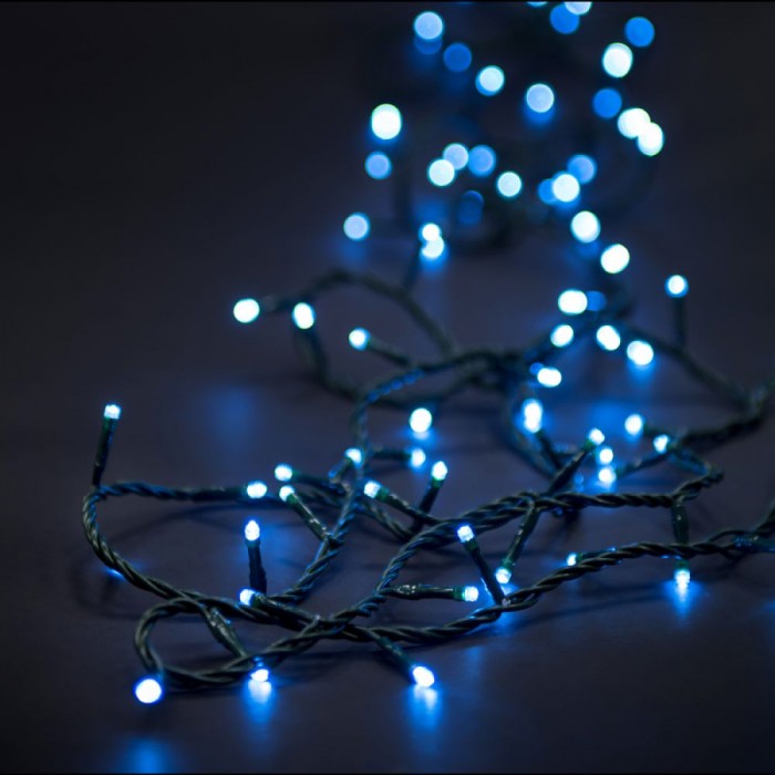 Коледни лампички, 100бр, LED, 8 програми, 6,8метра, зелен кабел, бели